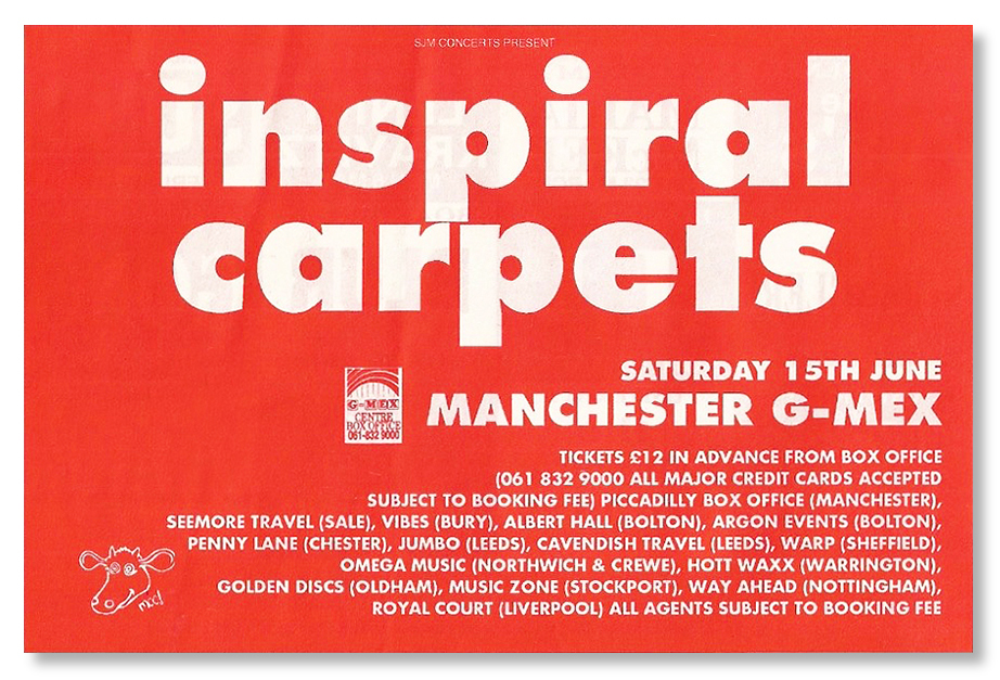 One year later, Inspiral Carpets returned to G-Mex as the ‘Madchester’ scene raved on. Not as memorable as the previous year’s gig at the same venue but the dye stains on the ticket imply it was another hot and sweaty one.
