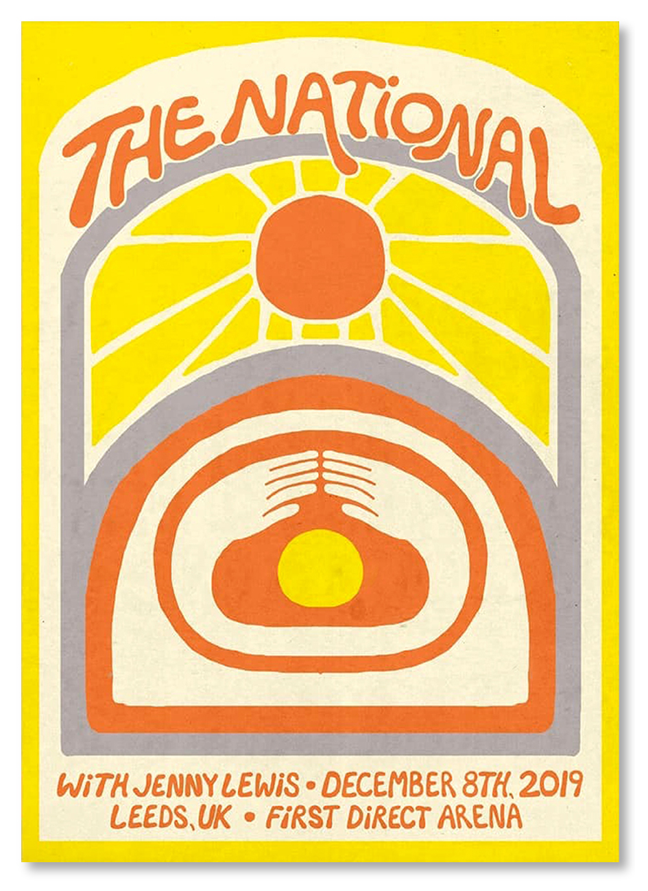 Even from the second tier of Leeds’ largest live music venue, there’s an intimate warm winter feel to The National’s emotive music. They’re a band who still connect with their audience despite the scale of success. Chances to be part of that audience are few and far between, and the band seem to make every evening a special occasion. Each date of the tour had a beatifully bespoke poster design.